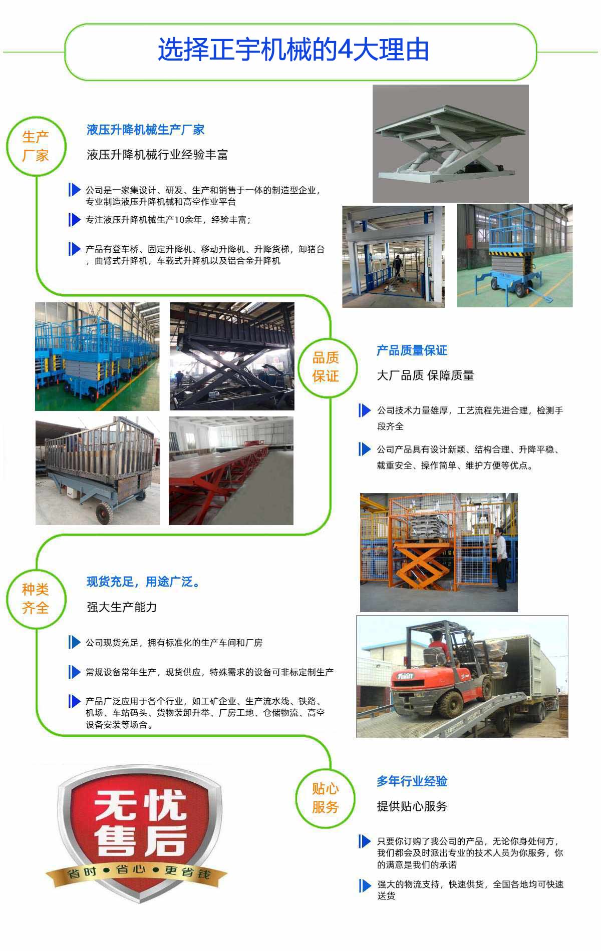 濟(jì)南正宇升降機(jī)械有限公司是一家集設(shè)計(jì)、研發(fā)、生產(chǎn)和銷售于一體的制造型企業(yè),生產(chǎn)液壓升降機(jī)械和高空作業(yè)平臺(tái),公司處于素有泉城美稱的山東省濟(jì)南市,坐落于濟(jì)北開發(fā)區(qū)。優(yōu)越的地理位置和便利的交通給公司的發(fā)展帶來了充分的條件。正宇液壓技術(shù)力量厚,工藝流程先進(jìn)合理,檢測手段齊全。目前主要產(chǎn)品有:高空作業(yè)平臺(tái)、登車橋、固定升降機(jī)、移動(dòng)升降機(jī)以及鋁合金升降機(jī)等等。公司產(chǎn)品具有設(shè)計(jì)新穎、結(jié)構(gòu)合理、升降平穩(wěn)、載重安全、操作簡單、維護(hù)方便等優(yōu)點(diǎn)。產(chǎn)品廣泛應(yīng)用于各個(gè)行業(yè),如工礦企業(yè)、生產(chǎn)流水線、鐵路、機(jī)場、車站碼頭、貨物裝卸升舉、廠房工地、倉儲(chǔ)物流、高空設(shè)備安裝等場合。公司以誠信、創(chuàng)新、穩(wěn)健為宗旨,以品質(zhì)、完善服務(wù)的理念,迎接市場的挑戰(zhàn)。期待您的咨詢!